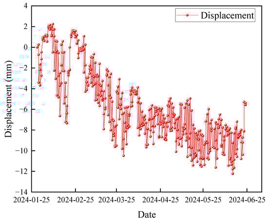 To accurately assess the stability of the slope, continuous monitoring of surface displacement is conducted. Initially, the monitoring area and the locations of appropriate monitoring points are established. The safety conditions of the slope are evaluated based on the collected monitoring data. In this study, a total of 440 sets of slope monitoring data, collected from 29 January 2024 to 24 June 2024, are analyzed. The data from the monitoring points are compiled to generate the slope displacement–time diagram, as illustrated in Figure 2.
