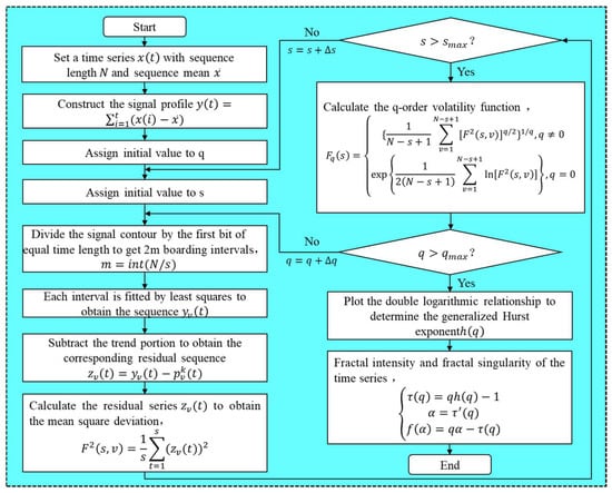 In the contexts of stochastic processes, chaos theory, and time series analysis, detrended fluctuation analysis (DFA) serves as a method for calculating the (or Hurst exponent) to assess the statistical self-similarity of a signal. However, traditional DFA computes only second-order statistical moments and assumes that the underlying process follows a normal distribution. In contrast, the MF-DFA evaluates all -order statistical moments , providing a more comprehensive characterization of nonlinear data and non-smooth signals compared to traditional DFA. The calculation flow for MF-DFA is illustrated in Figure 3.