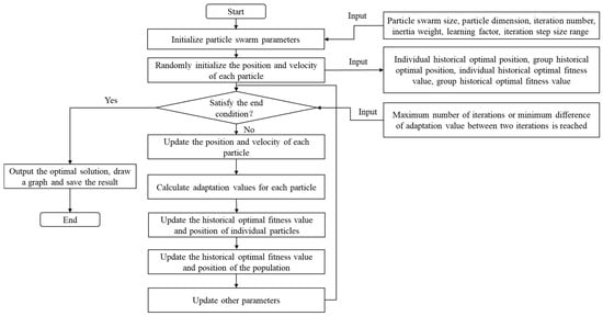 The PSO algorithm was developed by researchers inspired by the foraging behavior of birds. In this algorithm, each particle simulates the foraging behavior of a bird, with each particle in the swarm maintaining its own established direction while searching for the optimal value. Additionally, each particle communicates its current value and position to the swarm. Consequently, each particle adjusts its search direction based on its own experience as well as the position of the optimal value recorded by the swarm. The flow of the PSO algorithm is illustrated in Figure 4.