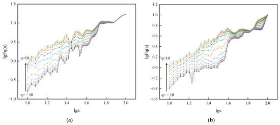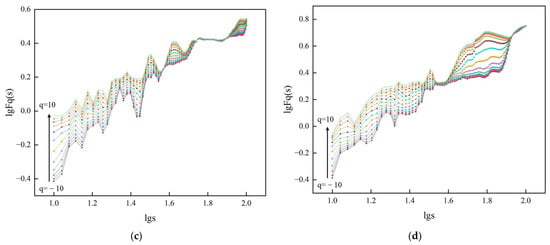 To perform multifractal analysis on each group of surface displacement monitoring sequences of the slope, we employed a sliding time window optimization method using the MF-DFA. In this analysis, the fluctuation order is varied over the range of [−10, 10], while the scale is set within the range of [10, 100]. The sliding window step is defined as 1. The resulting double logarithmic scatter plot of is illustrated in Figure 5.