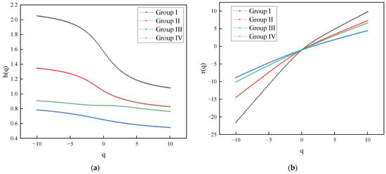 As illustrated in Figure 6a, the generalized Hurst exponent of the surface displacement data series for the slope exhibits a nonlinear decreasing trend as varies within the range of [−10, 10]. This trend indicates that the surface displacement data at the monitoring sites is characterized by multifractal properties. Notably, for different fluctuation orders , the generalized Hurst index curves of the second, third, and fourth groups are positioned at lower fluctuations compared to the first group, suggesting a weaker multifractal feature in these groups. However, the values for each group’s displacement series are all greater than 0.5. Indicating that the displacement sequences possess strong memory and long-range correlations from the overall structure to local components.