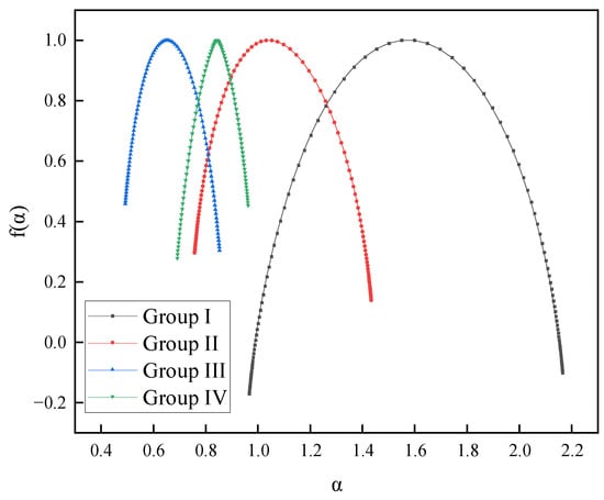 Table 1 reveals a comparison of the widths of the multifractal spectra for each group of displacement sequences, denoted as . The multifractal spectral width of the first group is significantly greater than that of the other three groups, indicating that the multifractal intensity of the surface layer displacement sequences in the first group is higher, and the displacement fluctuations are more complex.