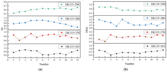 Using the aforementioned parameters, the four data series were analyzed through multifractal analysis with Matlab (R2018b) software. The generalized Hurst exponent and Renyi exponent—specifically, the scalar function—for each group of displacement sequences were computed across varying values of . The changes in the indices corresponding to the measurement point sequences are presented in Figure 6. Furthermore, the multifractal spectra for each group of displacement sequences are displayed in Figure 7.