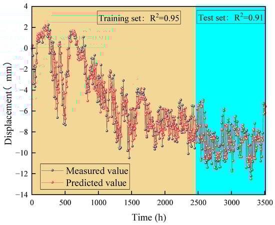 The hyperparameters obtained from the PSO optimization were utilized as inputs for the LSTM model, which was subsequently trained on the input data. Through multiple iterations of training, the model’s prediction accuracy was improved to an acceptable level. The 440 slope surface displacement data presented in Figure 4 were chosen for prediction, with 70% of the data designated as the training set and the remaining 30% allocated as the test set. The PSO-LSTM model underwent both training and testing, with the results of the slope surface displacement prediction illustrated in Figure 9.