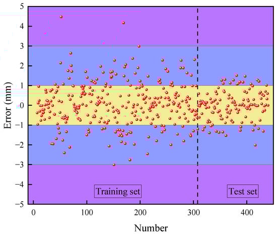 As shown in Figure 10, a comparison of the sample error calculations from the PSO-LSTM model for predicting the slope surface displacement indicates that the maximum errors for the training set and the test set are 4.47 mm and −2.02 mm, respectively. Overall, approximately 70.7% of the samples exhibited prediction errors within ±1 mm, while about 99.3% of the samples demonstrated errors within ±3 mm. Notably, the maximum prediction error for the model’s test set is significantly smaller than that observed for the training set, suggesting that the PSO-LSTM model yields lower sample errors in predicting slope surface displacement. This finding further underscores the superior performance of the PSO-LSTM prediction model.