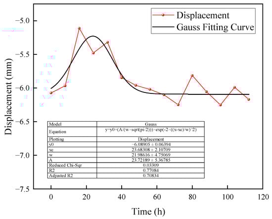 As illustrated in Figure 11, analysis of the prediction results reveals that the slope surface displacements initially increase, followed by a decrease, and ultimately fluctuate around a stable value. Gaussian fitting indicates that the slope surface displacement eventually stabilizes, further validating the accuracy of the slope Level III warning results derived from multiple fractal eigenvalue analyses.