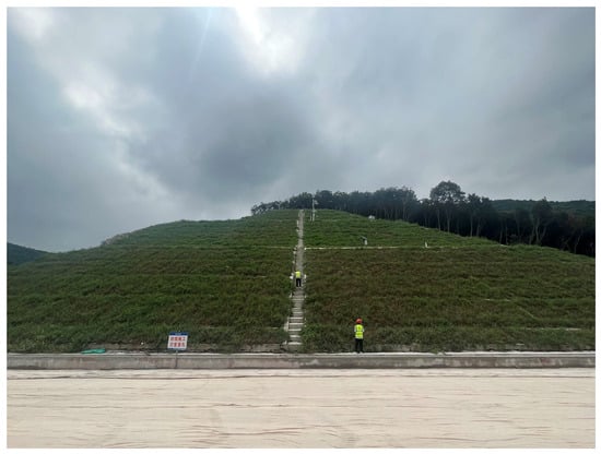 In summary, the results from the slope landslide warning levels and the predictions of slope surface displacements demonstrate a coherent response, indicating that the slope surface displacement is trending toward stability. Continuous monitoring and inspection are necessary to ensure the safety and stability of the slope. The slope site inspection is shown in Figure 12.