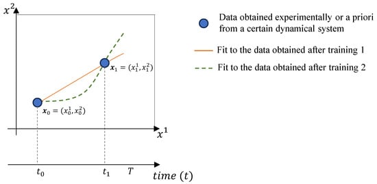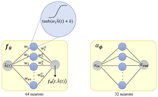 In Figure 1 and Equation (8), we observe h as a function of t. However, the NN depicted on the left side of Figure 1 does not use t as an input. Instead, the NN is called at each iteration of the numerical solver that addresses a discretised version of Equation (1). This solver defines all time instants through a mesh over the interval [], and consequently, each evaluation of is always associated with a specific time instant.