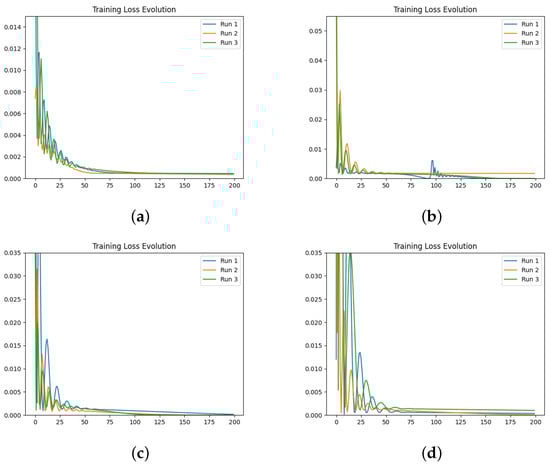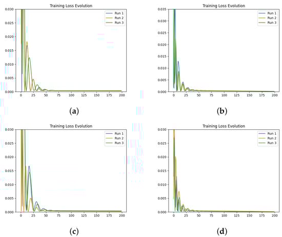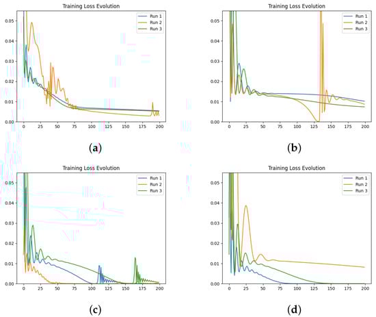 Training loss evolution for Neural FDE when modelling for (a) , (b) , (c) , and (d) initialisation (loss (vertical axis) vs. number of iterations (horizontal axis)).