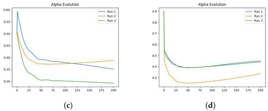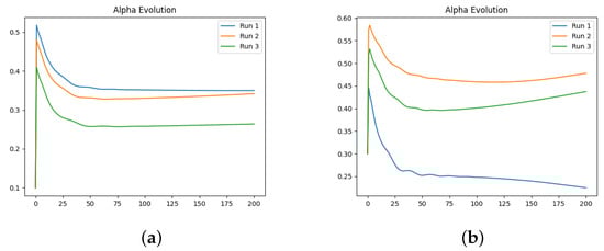 The generated datasets were used to train the Neural FDE model (see Equation (1)) with four different initialisations of the derivative order: , , , and . For each initialisation, three independent runs were conducted considering 200 iterations.