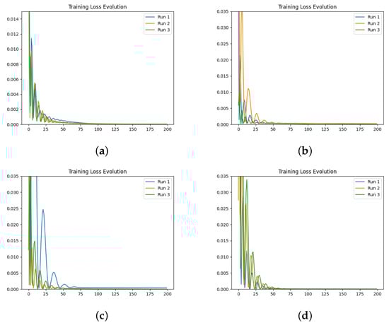 The results obtained for each dataset, , , and using the various initialisation values are presented in Table 1, Table 2 and Table 3, and the evolution of the training losses and values can be visually observed in Figure 3, Figure A1, and Figure A2 and Figure 4, Figure A3, and Figure A4, respectively.