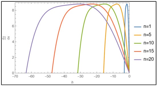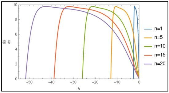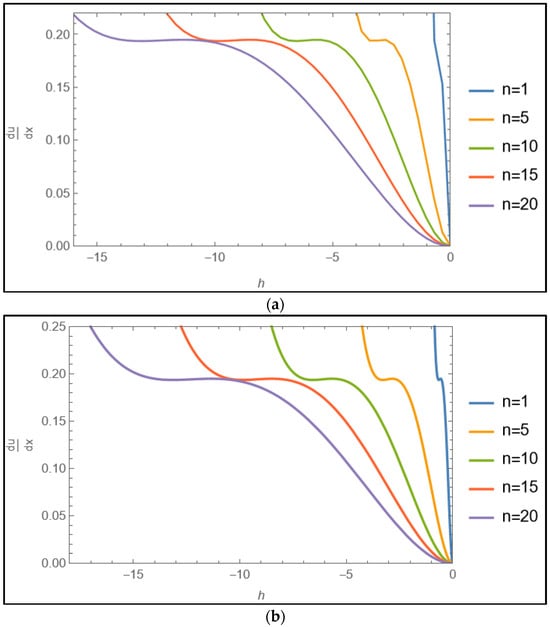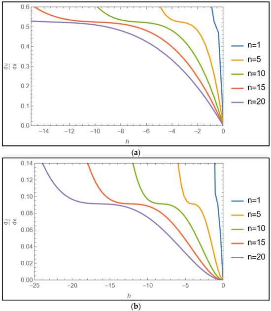 The -curve graphs for and at are given in Figure 9a,b. Here, four terms are used for the q-HAM solution. The optimal values can be determined in the convergence region where .