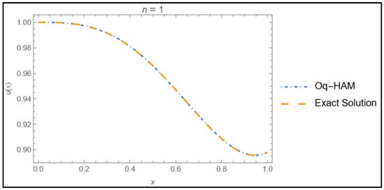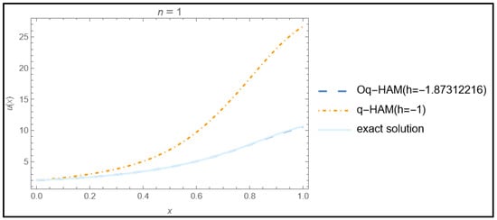The solutions obtained with q-HAM have varying relative errors, depending on the choice of the value of the auxiliary parameter . Figure 6 presents the solution curve obtained by using the optimal value in comparison to the solution curve obtained with q-HAM using As the value of the parameter approaches its optimal value, the relative errors are expected to decrease, which also means the curves from Oq-HAM and q-HAM become closer. The results in Table 7 and Table 8 and the curves in Figure 6 are a clear indicator of the importance of using the optimal value. This value, obtained by analyzing the square errors to obtain the minimal error, clearly results in a better approximation to the exact solution.