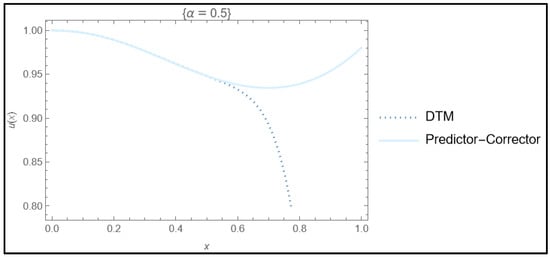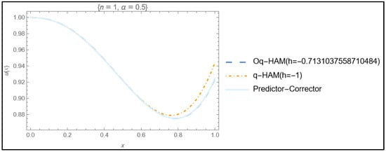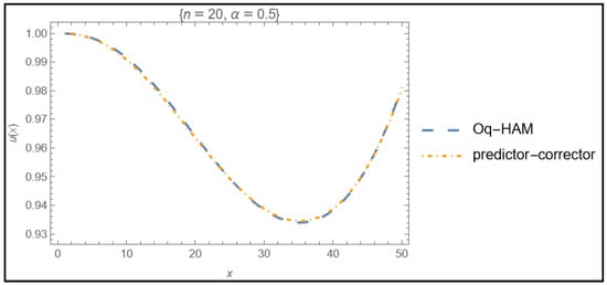 The numerical solution graphs of the optimal q-HAM and the PC method for the values obtained are shown in Figure 10 and Figure 11. Only one plot has been given for and in both figures, since these values of the parameter produce inseparable solution curves.