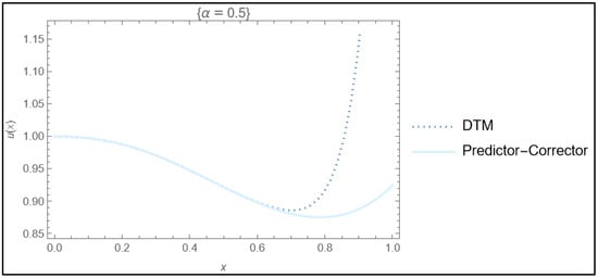 Approximate solutions of fractional Abel equations have also been obtained with fractional DTM to highlight the improved convergence obtained with optimal q-HAM. A similar growth in relative errors, along with the increase in , is seen for both methods. However, as Figure 12 suggests, the relative error of DTM at is almost 3375 times more than the relative error obtained with Oq-HAM . Further discussion of Oq-HAM is given in comparison to the exact solutions and numerical solutions obtained with the predictor–corrector method. Figures and tables provide results that verify that optimal q-HAM is a reliable tool for the investigation of fractional Abel differential equations.