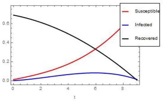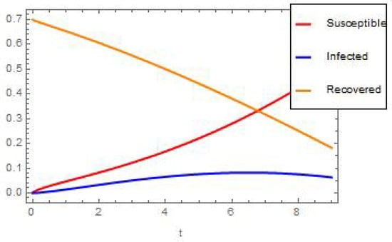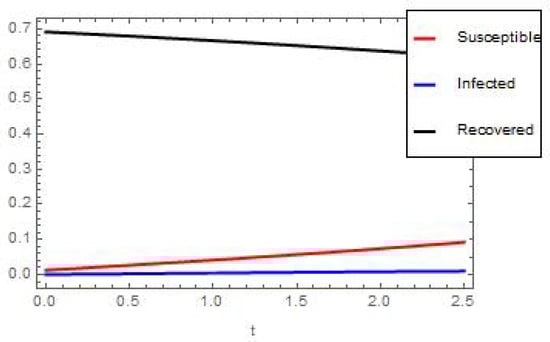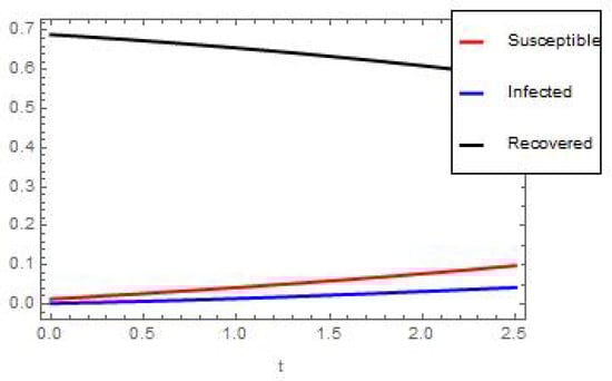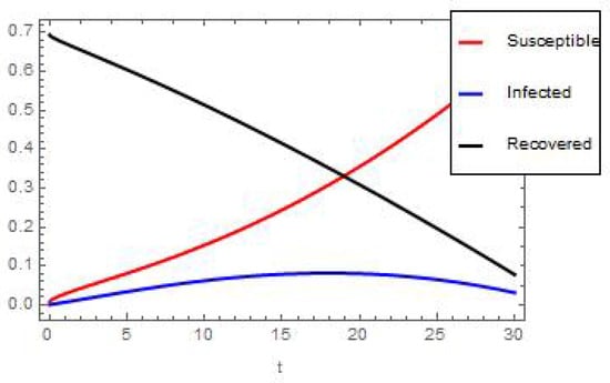 Now focusing back on our topic, in this paper, we have decided to analyze the effect of diffusion on the system. To be more specific, we have taken the system of an SIR model [,,,,] of pertussis. This is a very highly contagious bacterial infection. This infection spreads from person to person through social contact. Pertussis has shown extreme growth in the last few decades. As per a report, around 600,000 deaths per year are caused by pertussis around the globe. The main reason of its spread is airborne discharge from the mucous of infected persons. Vaccination has shown some resistance but is not as effective as it should be. Here, we have taken the SIR model given by G. G. Parra et al. []. We have added a diffusion factor into the existing model to analyze its effect. We have used the general fractional derivative along with Laplace transformation to achieve our objective. We have used this particular operator (generalized operator) since we can obtain three different results by just changing the kernel of the function, and we can obtain a comparative analytic view by using three different kernels. We have used the generalized operator here because we can compare the results for a classical operator (RL) with non-singular and non-local operators. One more important thing with this paper is the mentioned SIR model is not described by any of the fractional operators till date, so this is a unique problem which we have tried to discuss and analyze. In this paper, we have used the Riemann Liouville derivative (a kind of generalized derivative) rather than Caputo, since our main objective is to analyze the SIR model by generalized fractional derivatives and not only Caputo. We have also presented the existence and uniqueness of our novel approach, and this approach is well supported by the graphical results of the model as well [,,].