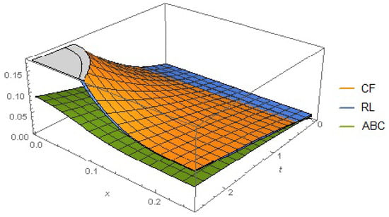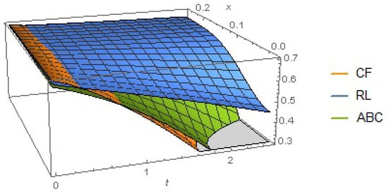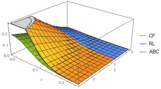 So, Equations (1) and (2) may be used to obtain the derivatives of Atangana–Baleanu–Caputo (ABC) and Atangana–Baleanu–Riemann–Liouville. The AB type integral is []
