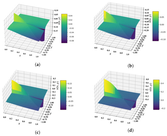 In Figure 2, we can see that when changing the parameter in domain , the subdiffusion mode is enhanced due to the fact that the diffusion process proceeds more slowly than normal diffusion. We see that the region of positive values of the solution function expands, and the region of negative values, on the contrary, narrows. In domain the wave mode proceeds, the shape of which is also affected by the values of parameter .