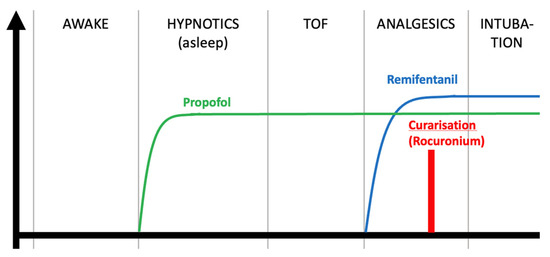 Graphical representation of the clinical protocol [13]. The regions of interest are delimited as indicated. TOF—train of four.