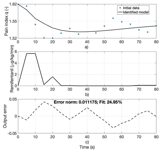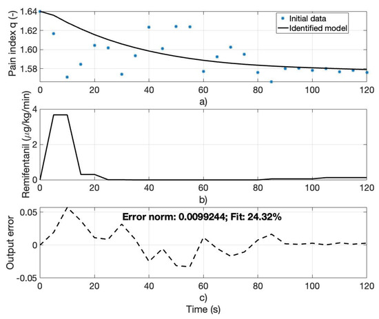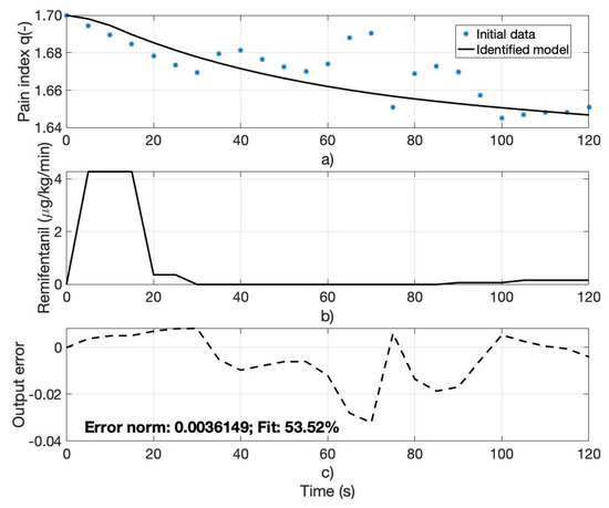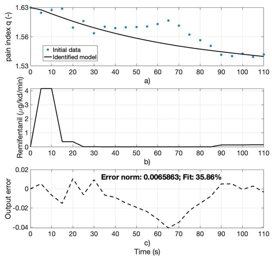 (a) Computed pain index q (initial data) for patient 70 and the identified analgesia model output, (b) Remifentanil progression rate for patient 70, (c) output error between the computed and identified model outputs.