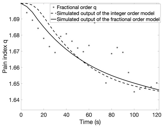 The drawback of the NM algorithm consists of the dependence of the search performance upon the initial points. To achieve good optimization results, it is crucial to provide proper initialization. Several combinations of the initial q parameters were tested by trial and error. Using frequency domain identification tools, as described in Section 2, unstable transfer functions were obtained for commensurate fractional orders q < 1. Stable transfer functions were obtained for q in the range of [1, 2]. To estimate the fractional-order models, an initial starting value q* = 1.5 was used in the optimization method for all patients. For simplicity, only the results for patient 70 are presented here, although the same conclusions can be drawn by analyzing the results for different patients. Table 2 summarizes the cost functions obtained with the various fractional-order (FO) models.
