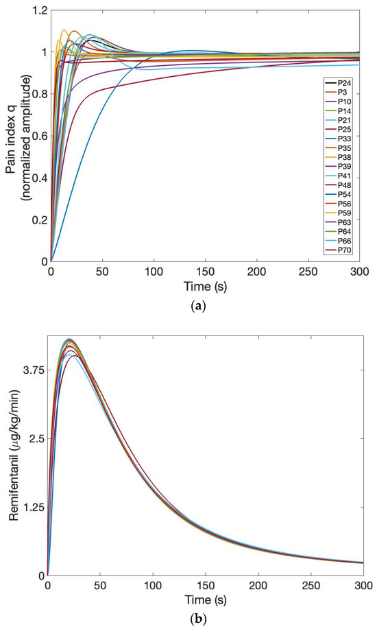 Figure 9a,b shows the closed-loop simulation results for the pain index q for all patients in Table 1, as well as the corresponding Remifentanil progression rate. The amplitude of the pain index q was normalized for a more accurate comparison. The results in terms of overshoot and settling time are indicated in Table 5. The results correspond to the pharmacological properties of Remifentanil, with a rapid onset of action of approximately 1 min [57]. In some cases, the settling time is significantly less than 1 min and well above 5 min (more than 300 s), as indicated in Table 5. The overshoot for the nominal patient P24 is 5% and remains small (maximum 10%) for all other patients included in this case study. The Remifentanil maximum drug rate indicated in Figure 9b corresponds to experimental data, as seen in Figure 4, Figure 5 and Figure 6, for example. However, the drug rate is maintained at a higher level (similarly to [54] for a longer period of time, which leads to a faster settling time for some patients (less than 60 s, as indicated in Table 5). The steady-state value of Remifentanil drug rate is approximately 0.4