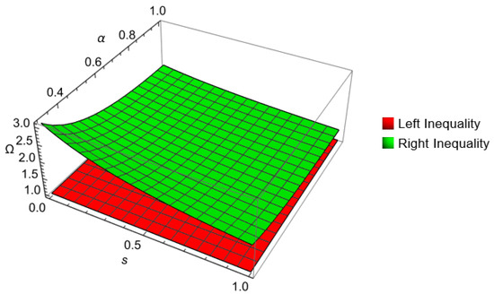 The graph of the inequalities of Example 3 is depicted in Figure 2 for and , which demonstrates the validity of Theorem 7.