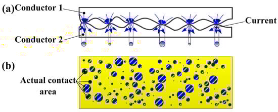 The formation mechanism of contraction resistance is shown in Figure 1. Combining the analysis with Figure 1a, due to the roughness characteristics and geometric diversity of the surface micro-morphology, the current will not be distributed uniformly across the entire contact surface. Instead, it flows concentratedly through those extremely small conductive spots (also known as the asperity). The contact resistance at these conductive spots is much smaller than that of the non-contact areas, resulting in a contraction phenomenon of the current at the contact asperities.