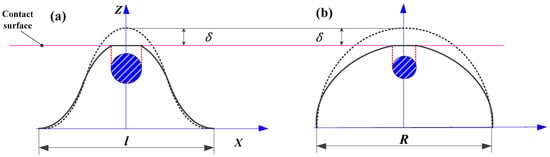 When the indentation depth is δ, through geometric calculations based on Figure 4, the relationship between the indentation depth δ and the geometric shape parameters h and l of the asperity can be obtained.