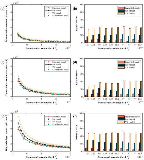 To illustrate and validate the benefits of the model presented in this paper, a comparison of the results was augmented with the Pan model for the hemispherical asperity [43] and the Y–K model without considering the elasto-plastic deformation of the asperity [18]. A comparison of the results of the three models with the experimental results is shown in Figure 6. As depicted in Figure 6, the comparative results present the contact resistance and relative error under different roughness levels. Specifically, Figure 6a,c,e, respectively, showcase the comparison results of the contact resistance at Sa 0.017 μm, Sa 0.057 μm, and Sa 0.096 μm. Figure 6b,d,f displays the comparative results of relative error at Sa 0.017 μm, Sa 0.057 μm, and Sa 0.096 μm, respectively.