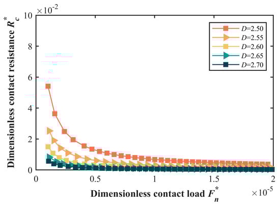 The variation curve of the dimensionless contact resistance Rc* with respect to the dimensionless contact load Fn* across different fractal dimensions is presented in Figure 7. Generally, the Rc* exhibits a similar trend to the Fn* under varying fractal dimensions. Specifically, contact resistance diminishes as the contact load escalates, with the decrement rate progressively decelerating. According to Equation (53), as the contact load increases, the conductive area of asperities within the interface gradually expands, leading to a consistent reduction in contact resistance. Concurrently, the decrement rate of the contact resistance slows down due to the gradually diminishing rate of increase in the conductive area.