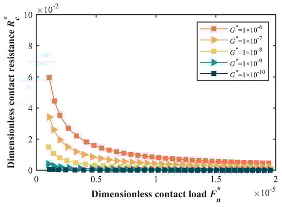The variation curve of the dimensionless contact resistance Rc* with respect to the dimensionless contact load Fn* under varying scale coefficients is presented in Figure 8. Generally, the Rc* exhibits a similar trend as the Fn* across different scale coefficients. Specifically, contact resistance diminishes as the contact load escalates, with the decrement rate progressively decelerating. Akin to the simulation results under varying fractal dimensions, as the contact load intensifies, the conductive area of the asperities within the interface gradually expands, leading to a consistent reduction in contact resistance. Concurrently, the decrement rate of contact resistance slows down due to the gradually diminishing rate of increase in the conductive area.