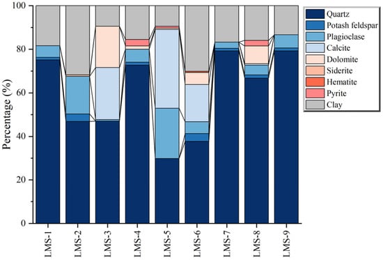 Quartz, clay minerals, plagioclase, and calcite are the primary mineral components of the Longmaxi Formation shale (Figure 2). Quartz exhibits the highest content, ranging from 29.8% to 79.2%, with an average of 59.4%. Clay and feldspar exhibit varying contents, ranging from 9.4% to 31.7% (with an average of 17.8%) and from 0.7% to 23.1% (with an average of 9.4%), respectively. Some samples, such as LMS-3, LMS-5, and LMS-6, exhibit high carbonate mineral contents (calcite + dolomite), ranging from 8.1% to 42.9%. In addition, the Longmaxi Formation shale samples contain minor amounts of metallic minerals, including siderite, hematite, and pyrite.