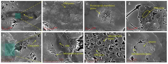 FE-SEM images of different types of pores in the LMS-5 and LMS-8 shale samples. (a) Organic matter (OM). (b) Convoluted OM pores in an organic area with clay. (c) Intragranular pores of strawberry-like pyrite after shedding. (d) Spongy OM pores in an organic-rich area. (e) Intraparticle pores in clay. (f) Interparticle pores in clay. (g) Organic pores with different particle sizes. (h) Intraparticle pores in quartz.