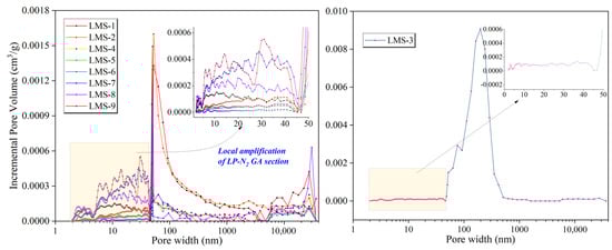 Pore-size ranges applicable to different techniques vary. To better and more conveniently characterize the multiscale PSD in shale, this study combines mesopore data (2–50 nm) obtained from LP-N2 GA with macropore data (>50 nm) derived from MIP. Figure 4 illustrates incremental fluid intrusion across different pore-size ranges. PSD characteristics vary significantly among the samples, with pore volume primarily concentrated in the 10–200 nm range. Notably, sample LMS-3 exhibits a pronounced increment at a pore size of 200 nm. The majority of the OM pores have diameters smaller than 50 nm, which falls within the primary adsorption range for shale gas. As shown in the Figure 4, the incremental changes in the micropore/mesopore range fluctuate significantly and exhibit considerable variability, indicating that the PSD of nanoscale pores (<50 nm) in shale is complex, and characterized by heterogeneity.