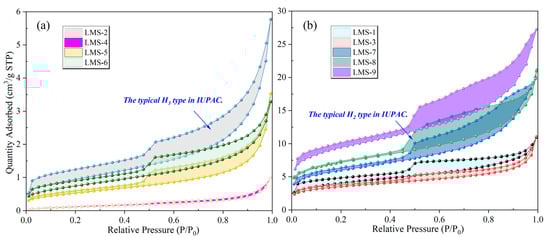 The shapes of the hysteresis loops observed in nitrogen adsorption and desorption isotherms serve as an indicator of the dominant pore types in shale. Owing to slight differences in the weights, the maximum total adsorption values vary significantly. To better present the hysteresis loop shapes, the data are displayed in two separate graphs (Figure 5). The nine shale samples predominantly exhibit H2-type and H3-type hysteresis loops. The H2–type loop, represented by sample LMS-2, indicates the presence of narrow, ink-bottle-shaped pores. In contrast, the H3–type loop, exemplified by sample LMS-8, suggests the development of plate-like pores, which are favorable for shale gas flow and diffusion. Certain samples, such as LMS-4, display almost no hysteresis between the adsorption and desorption curves, resembling the H4-type classification in the IUPAC system. It indicates the presence of numerous small slit-shaped, conical, and wedge-shaped pores.