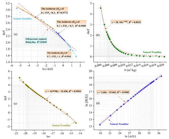 where Nmax represents the amount of adsorbate adsorbed as X tends to 1, and σ represents the surface tension of the adsorbate [33]. As shown in Equation (3), the Kiselev relationship links N and lnP through a power-law relationship, where S(X) represents the integral of lnX with respect to N. To some extent, the power-law function curve of lnX versus N can be approximated as a power curve [33]. The value of S(X) can be determined by fitting the power curve, using the corresponding function.