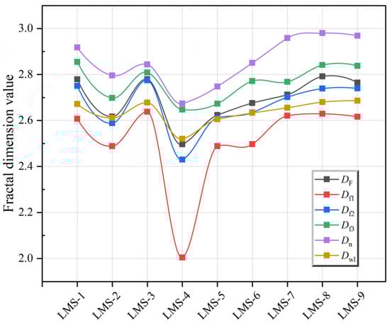 To better understand the computational processes and inherent differences among various fractal models, the intermediate fitting lines and final fitting plots required by each model were generated (Figure 6). On the basis of the fractal dimension values obtained from the three models for LP-N2 GA, it was observed that the Dn values were generally the highest. The Df values were found to lie between the Df1 and Df3 values, closely approximating Df2. When Df is considered representative of the FHH model, the DWL values are consistently smaller than those calculated by the other two models (Figure 7). Overall, the results follow the trend Dn > Df3 > Df > Df2 > DWL > Df1.