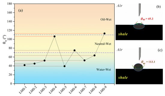 The CA is a crucial parameter for evaluating the wettability of a solid surface by a liquid, representing the liquid’s spreading ability on the solid surface [45]. For marine shale samples, the CA is commonly used to evaluate the wettability of oil, water, and gas in their pore structures. The CAs of distilled water on argon-ion-polished shale samples range from 41.8° to 113.1°, with an average of 65.4° (Table 2). Results indicate that most samples exhibit water-wet to neutral-wet characteristics, with only sample LMS-9 showing an oil-wet tendency (Figure 8). The variation in surface wettability may be affected by surface characteristics and material composition, particularly given the complex and heterogeneous pore structures of shale at the nanoscale.