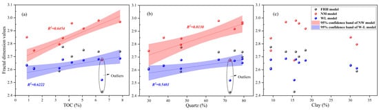 The connections between fractal dimensions derived from various fractal models and the material constituents. (a) The connection between TOC and fractal dimensions from the FHH, NM, and WL models. (b) The connection between quartz content and fractal dimensions from the FHH, NM, and WL models. (c) The connection between clay mineral content and fractal dimensions from the FHH, NM, and WL models.
