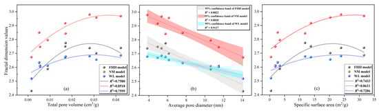 For shale gas reservoirs, pore volume, pore size, and specific surface area (SSA) are also key factors controlling the fractal characteristics of the pore structure [37,49]. The calculation results of the three fractal models exhibit a polynomial relationship with pore volume, with the NM model showing the highest fitting coefficient (R2 = 0.8518). Initially, the fractal dimension increases with pore volume. When the pore volume reaches a certain threshold, the fractal dimension stabilizes or slightly decreases (Figure 10a). Previous studies have shown that pore volume is primarily contributed by mesopores and macropores, and SSA is predominantly influenced by smaller micropores [50]. Therefore, the parabolic trend between pore volume and fractal dimension can be attributed to the enhanced pore volume, which in turn increases the likelihood of a uniform distribution of pores and improved connectivity. As shown in Figure 10b, the fractal dimensions calculated by all three models decrease with an increasing average pore size, with high fitting coefficients. This suggests that the presence of numerous larger pores promotes the development of a more homogeneous pore structure, consistent with the earlier explanation of the relationship between pore volume and fractal dimension. The SSA of shale reservoir pores is primarily contributed by OM micropores, which play a crucial role in determining the adsorption capacity for shale gas [51]. The relationship between fractal dimensions (Df2, Dn, and Dw) and SSA is similar to that with pore volume, following a polynomial regression function (Figure 10c). This can be attributed to the varying pore size contributions to SSA at different stages. When large-diameter pores dominate the contribution to SSA, the fractal dimensions tend to be lower. Conversely, when micropores are extensively developed and contribute significantly to the SSA, the fractal dimensions remain higher. The coupled relationships among pore volume, pore size, and SSA collectively influence the fractal characteristics of the pore structure.