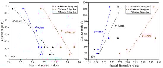 Relationship between shale CA and fractal dimensions. (a) Correlation between CA and fractal characteristics for highly overmature shale. (b) Correlation between contact angle and fractal characteristics for ultramature shale.