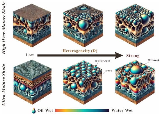 The trend can be explained from the perspective of OM maturation and evolution. In general, inorganic mineral components such as quartz and feldspar exhibit hydrophilic properties, and OM is hydrophobic. Dispersed OM typically exists in an embedded form in the intergranular spaces of large mineral particles (Figure 2). The wettability of some pore structures is influenced by the synergistic effects of both organic and inorganic components. Figure 12 illustrates the evolutionary model of wettability and fractal characteristics for highly overmature and ultramature shale. At the highly overmature stage of OM maturation, secondary cracking of OM generates numerous organic pores. Despite compaction, primary inorganic pores remain the dominant pore type [7]. Inorganic components exert a predominant influence on the wettability of pore surfaces. The enhancement of pore structure heterogeneity is primarily reflected on the strongly hydrophilic surfaces of inorganic minerals, leading to increased water wettability of shale and a reduction in CA (Figure 12). At the ultramature stage, secondary cracking of OM results in the further development of organic pores, which become the dominant pore type, and strong compaction significantly reduces the prevalence of inorganic pores [52]. At this stage, the complex pore structures indicated by the fractal dimension are primarily associated with the strongly hydrophobic surfaces of OM. Higher fractal dimensions reflect higher heterogeneity in the organic pore structure, leading to increased oil wettability of shale and larger CAs.