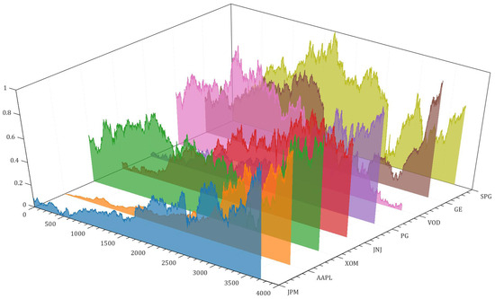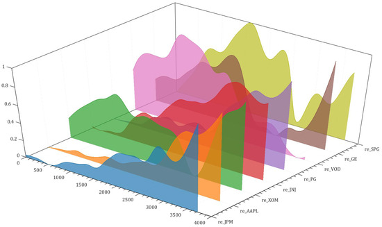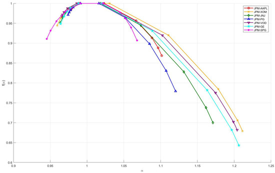 . The multifractal spectrum curves for the JPM stock and the other seven stocks all exhibit a concave function shape, a typical characteristic of a multifractal system. The concave function reflects the multi-scale nonlinearity and heterogeneity present in the time series. The varying trends of the multifractal spectrum curves for different stocks indicate that their multifractal characteristics are distinct. This may be attributed to differences in factors such as the industries, scales, and trading mechanisms to which these stocks belong. The width of the curves reflects the strength of the multifractal features. The wider the curve, the stronger the sequence’s multifractal properties. As can be seen from