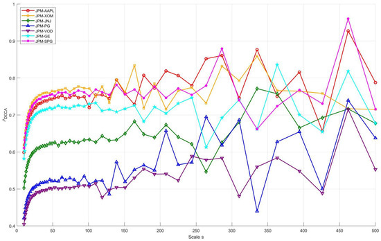 Figure 9, the curve widths differ significantly across the stock pairs. Therefore, we can further conclude that there is a strongly fractal cross correlation between JPM and the other seven stocks.