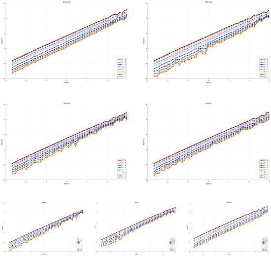 From an industry perspective, as a financial services company, JPM is more sensitive to broader economic and monetary policy changes. In contrast, XOM, as a company in the energy industry, is significantly influenced by fluctuations in energy prices, such as oil and natural gas. These factors are often subject to rapid and multi-scale variations, which may lead to stronger multifractal cross correlation between XOM and JPM over certain periods. On the other hand, SPG, representing the real estate industry, is more closely tied to the stability of the real estate market and long-term economic cycles. The smoothness of the log–log plots between JPM and SPG reflects these more stable and predictable dynamics, resulting in weaker multifractal cross correlation. The slope of the double-logarithmic curve in