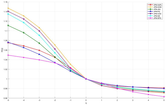 q increases, indicating apparent multifractal characteristics. The causes of these multifractal characteristics may involve several aspects. Firstly, the price fluctuations between these stocks exhibit a certain degree of long-range correlation, which persists across different time scales. Secondly, the diversity of market participants and the information asymmetry impact the long-range correlations between different time series, thereby leading to multifractal phenomena. Finally, the impact of extreme events, such as market crashes or rapid rebounds, also plays a crucial role. Since these stocks come from different industries and have distinct risk characteristics, extreme events may have varying effects on them, thus resulting in cross correlations of multifractality. The varying trends of the