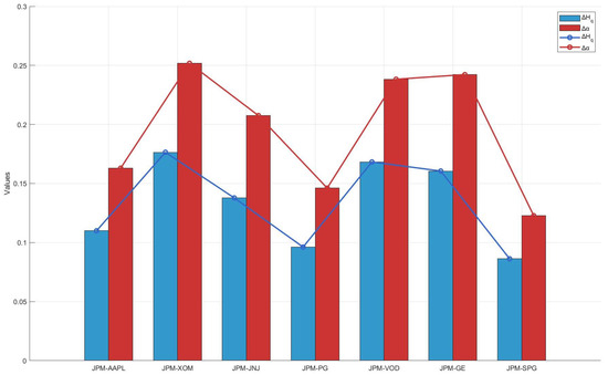 , which is the opposite. This indicates a strong multifractal cross correlation between JPM and XOM, suggesting that the relationship between JPM and XOM is more complex. The more intricate the interaction between assets, the lower the stability of their price fluctuations may be, leading to greater risks. In contrast, the weaker multifractal cross correlation between JPM and SPG suggests a lower multifractal strength between them, making JPM and SPG a more favorable choice for investors. Selecting a JPM-SPG combination in a portfolio could reduce financial risk and increase the profit potential. Additionally, the multifractal cross correlation between JPM and VOD, as well as between JPM and GE, is also strong.