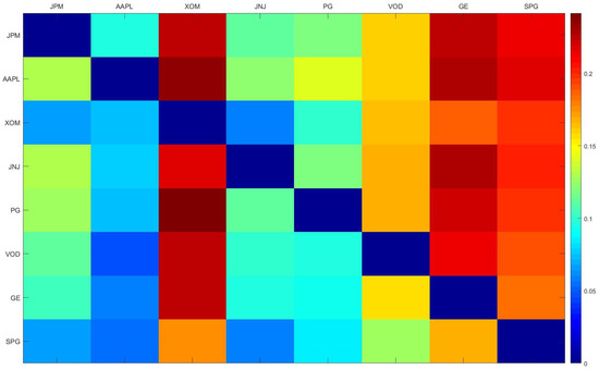 In summary, the largest information outflow from AAPL can be attributed to the following reasons: As one of the largest technology companies in the world, AAPL holds significant market influence. Known for its continuous innovation, AAPL consistently introduces new technologies and products that drive development across various areas and impact the operations of other companies. Its products and services are widely applied, leading to more frequent information flow between AAPL and other stocks, thereby enhancing its role as an information bridge. At the same time, the largest information inflow for XOM can be attributed to the following reasons: As one of the world’s largest oil and gas companies, the XOM stock price is highly dependent on energy prices, particularly those of oil and natural gas. Global energy price fluctuations are typically influenced by various factors, including international supply and demand dynamics, decisions made by OPEC (the Organization of the Petroleum Exporting Countries), geopolitical events (such as conflicts in the Middle East), and changes in the global economy. For instance, when global economic growth slows or political conflicts arise in certain regions, the energy demand and supply chains may be significantly affected, leading to sharp price fluctuations. Additionally, the OPEC production cut agreements or decisions to increase production can directly impact the global oil supply, further causing the XOM stock price volatility. Consequently, the XOM stock price is highly sensitive to these factors. This sensitivity links the XOM stock performance closely to other stocks, reflected in the transfer entropy calculations as higher information inflow. The heatmap below also reaches similar conclusions.