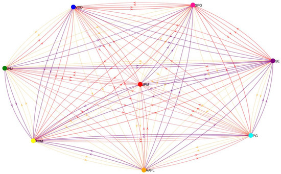 Figure 12 shows the information flow relationships among the eight stocks. The positions of the nodes and connections reflect the magnitude and direction of the transfer entropy between different stocks. The color of the connections represents the strength of information interaction: yellow lines indicate minor information flow, with transfer entropy values less than or equal to 0.1; red lines represent medium information flow, with transfer entropy values between (0.1, 0.2]; and purple lines denote the strongest information flow, with transfer entropy values greater than 0.2.